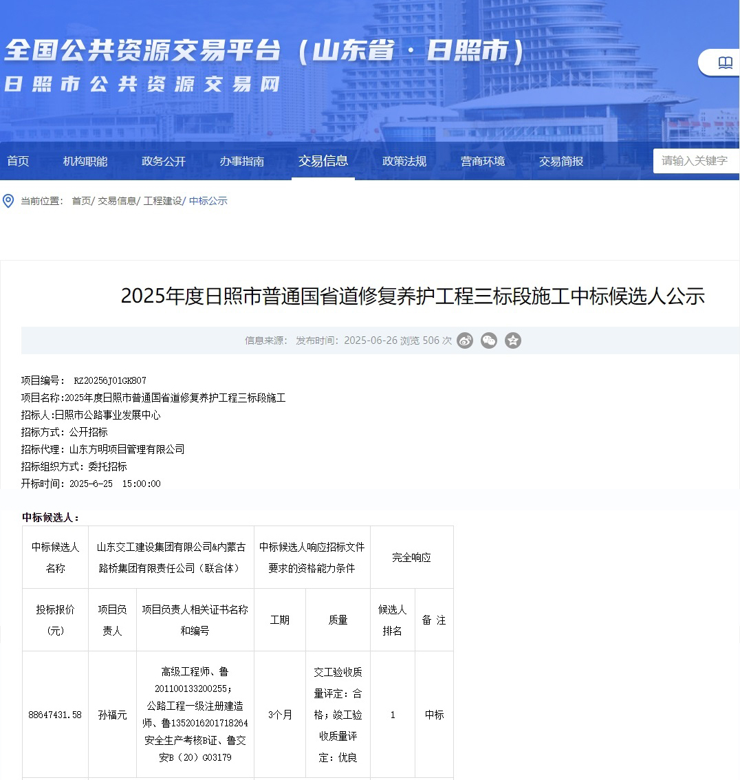 近日,日照公共資源交易網(wǎng)完成中標(biāo)結(jié)果公示,山東交建集團(tuán)成功中標(biāo)2025年度日照市普通國(guó)省道修復(fù)養(yǎng)護(hù)工程三標(biāo)段,中標(biāo)金額8864.74萬(wàn)元。