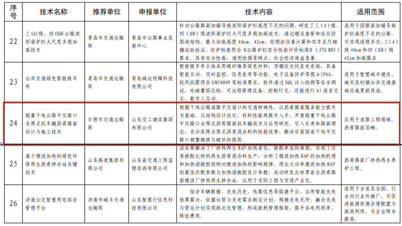 近日,山東省交通運(yùn)輸廳發(fā)布2025年度《山東省交通運(yùn)輸科技成果推廣目錄》,山東交建集團(tuán)申報(bào)的《極重干線公路平交路口全厚式抗車轍瀝青路面設(shè)計(jì)與施工技術(shù)》成功入選。